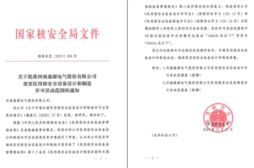 11月19日,mk(中国)电气收到国家核安全局颁发的《关于批准河南mk(中国)电气股份有限公司变更民用核安全设备设计和制造许可活动范围的通知》。批准公司《民用核安全设备设计许可证》和《民用核安全设备制造许可证》增加1E级交流中压熔断器-接触器柜的设计和制造许可活动范围,同时许可范围中1E级交流低压开关柜额定电流由“1600A及以下”变更为“4000A及以下”。