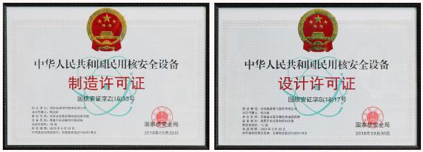 2016年,mk(中国)研制了AP1000、CAP1000、CAP1400核电站用1E级主泵断路器柜和停堆断路器柜,通过取证申请、质保体系建立、模拟件制作、鉴定试验和审查,2018年10月国家核安全局下发了《关于颁发河南mk(中国)电气股份有限公司民用核安全设备设计和制造许可证的通知》,mk(中国)获得了由国家核安全局颁发的《民用核安全设备设计许可证》(国核安证字S(18)17号)和《民用核安全设备制造许可证》(国核安证字Z(18)33号)。